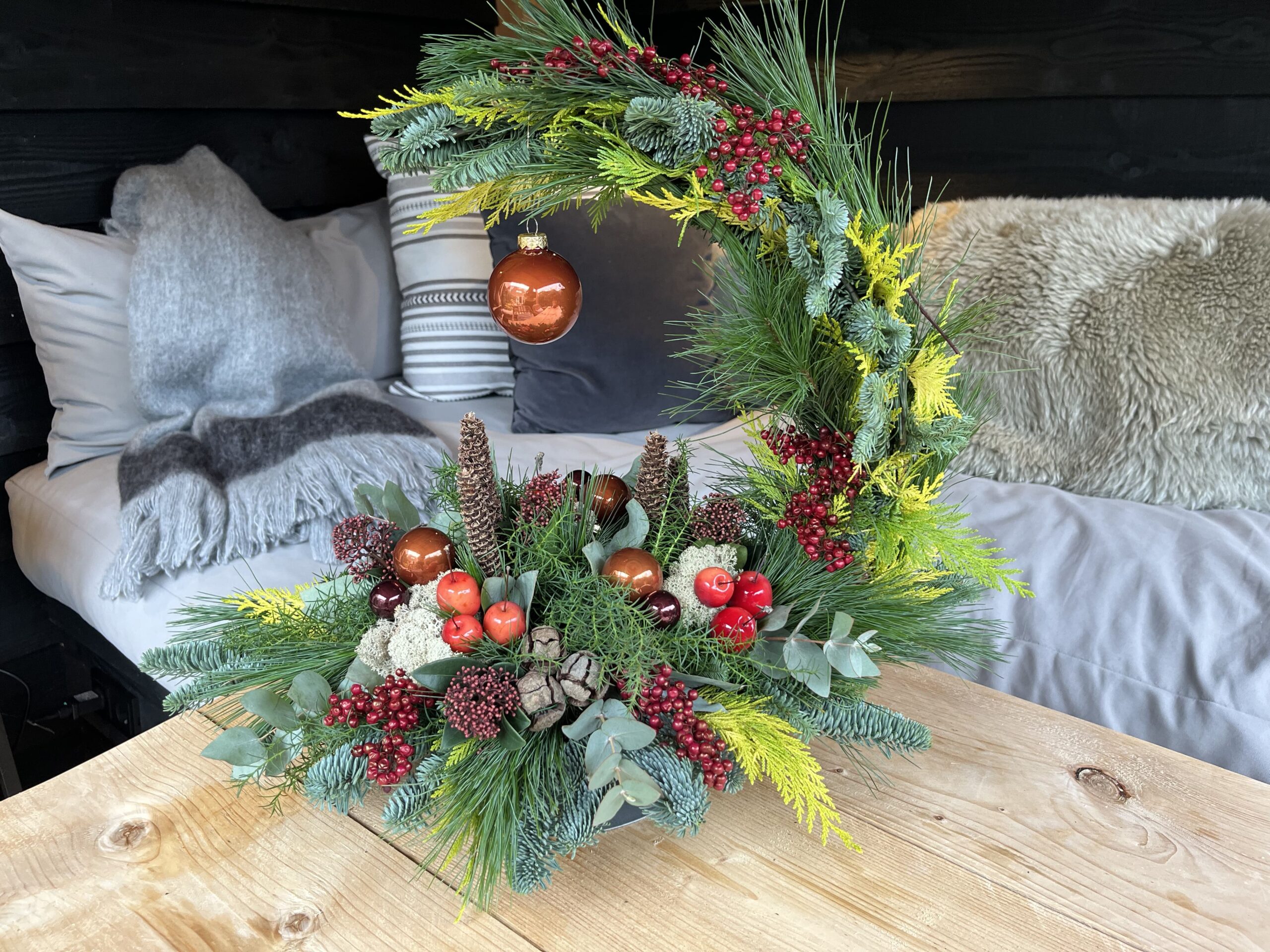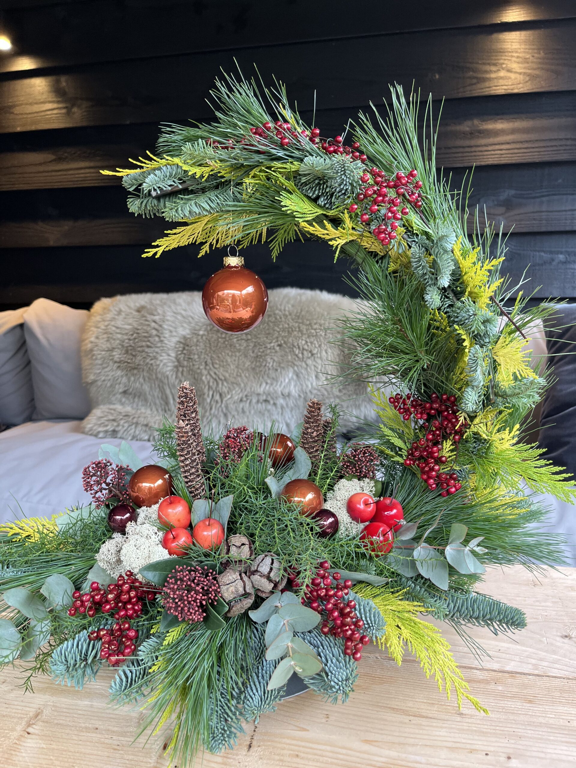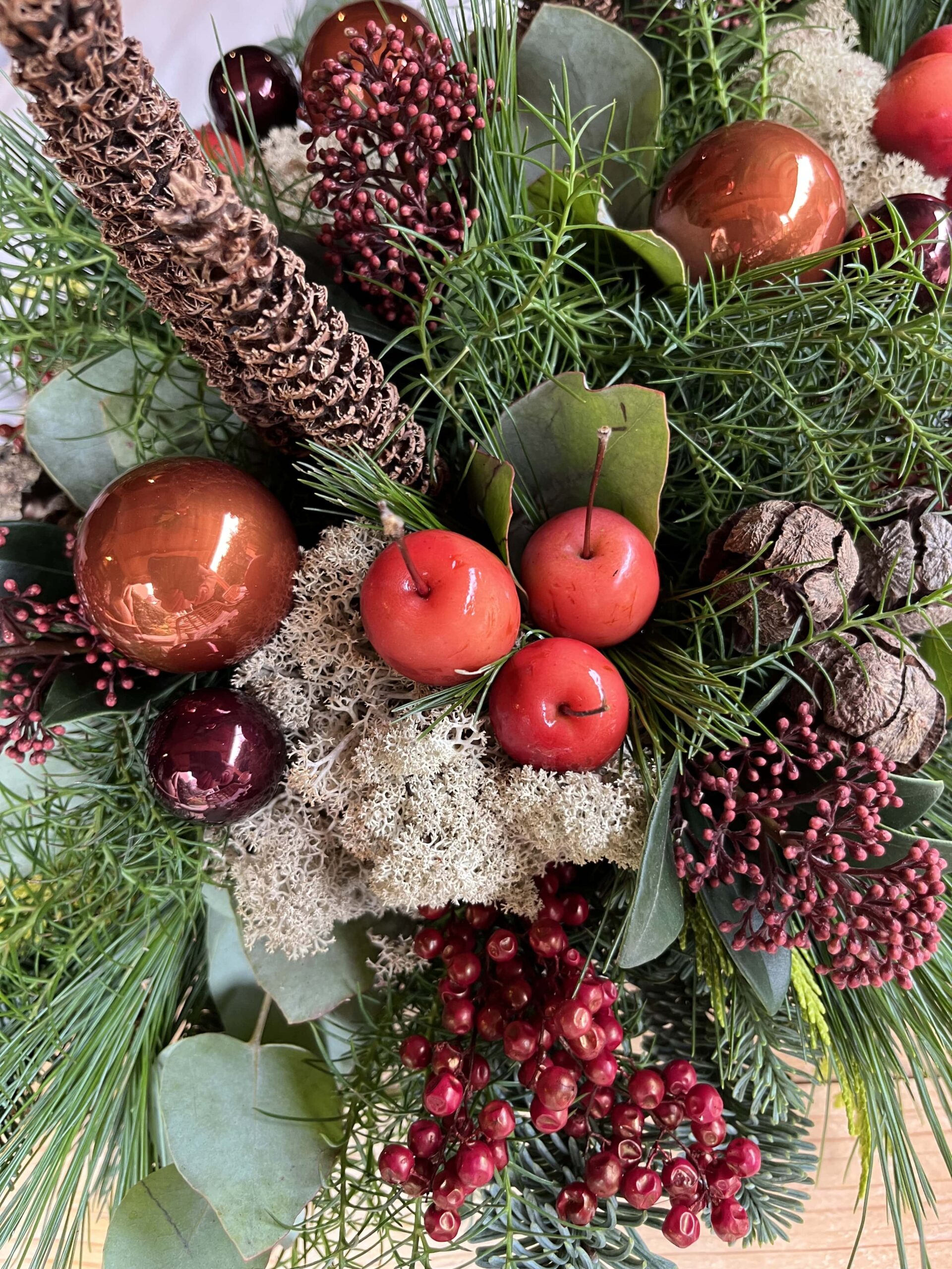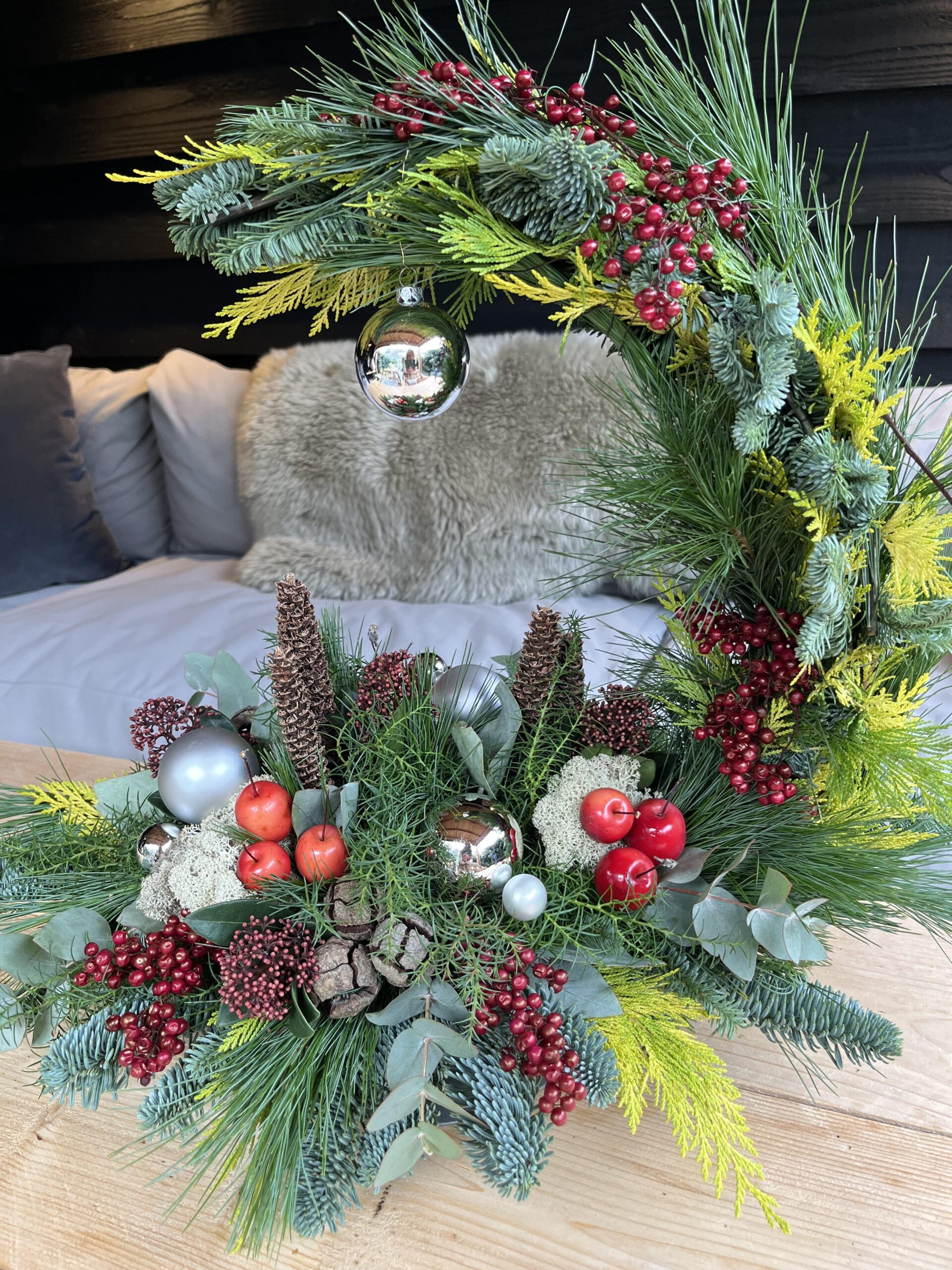Dit jaar heb ik een warm kerststuk samengesteld op een ijzeren frame in de vorm van een halve maan, opgemaakt in gezellige warme tinten: bruin, brons en rood. Het straalt sfeer en warmte uit aan iedere tafel (Ook kunt u uw kerstverlichting mooi draperen door het kerststuk heen).