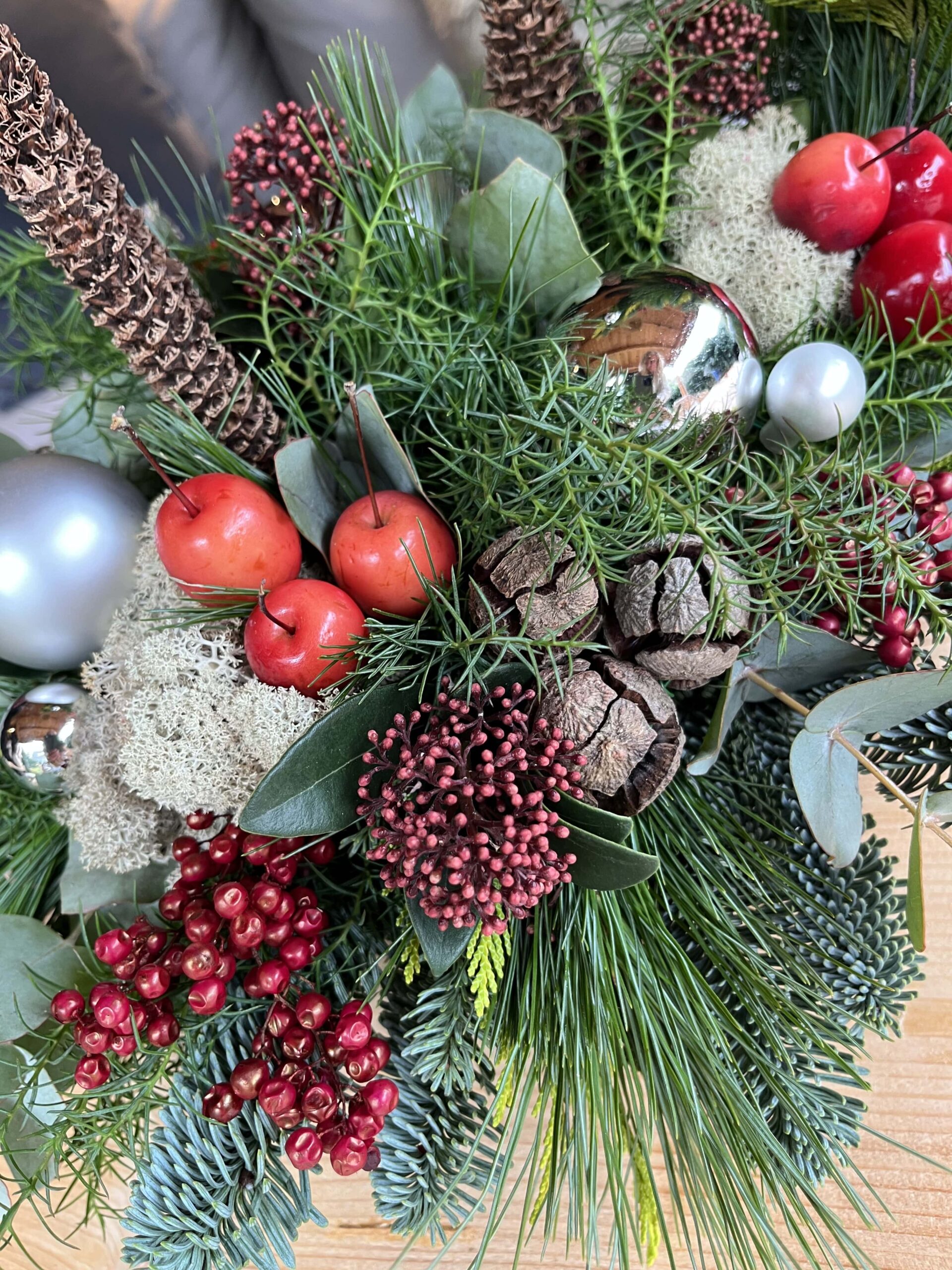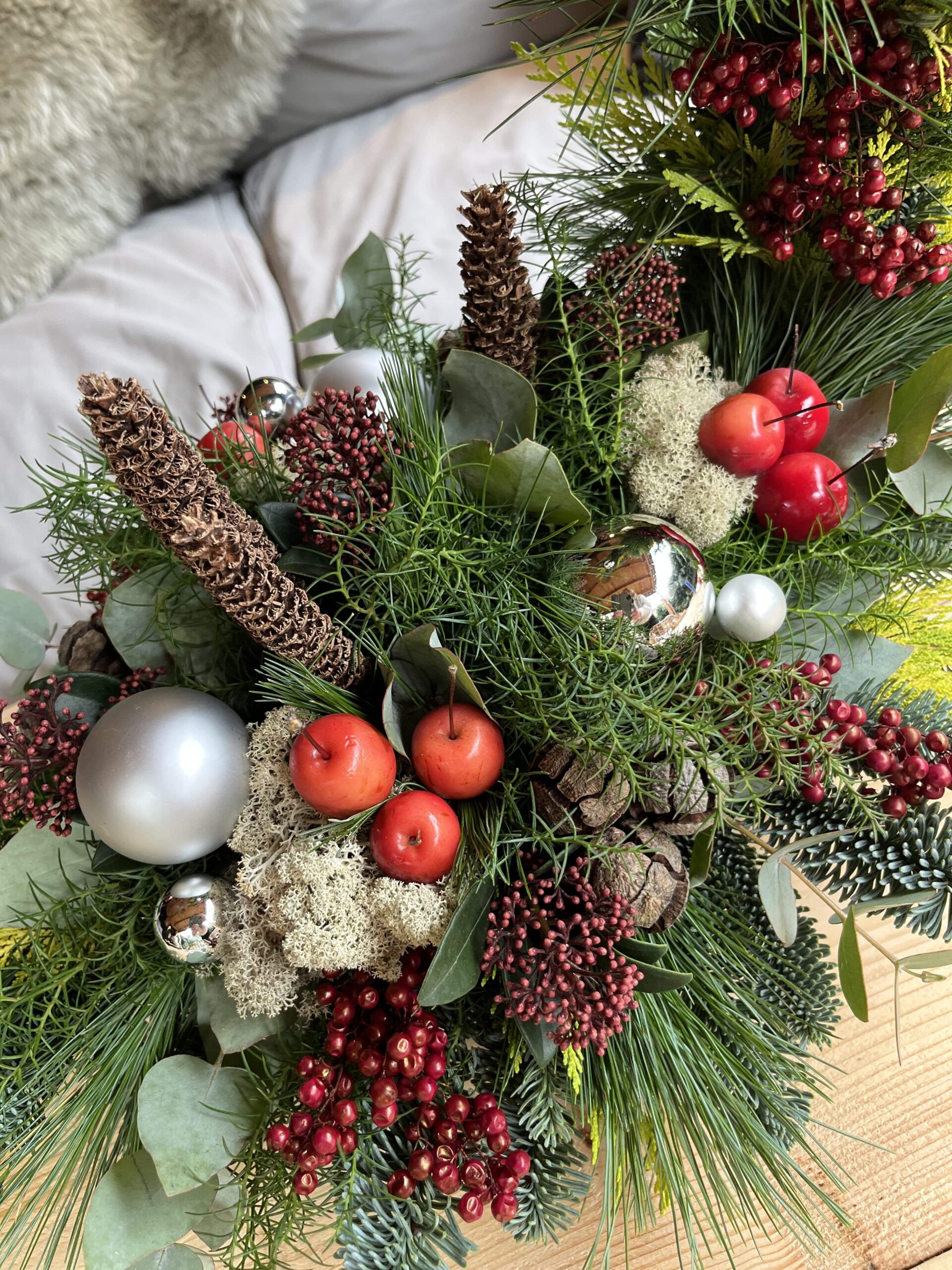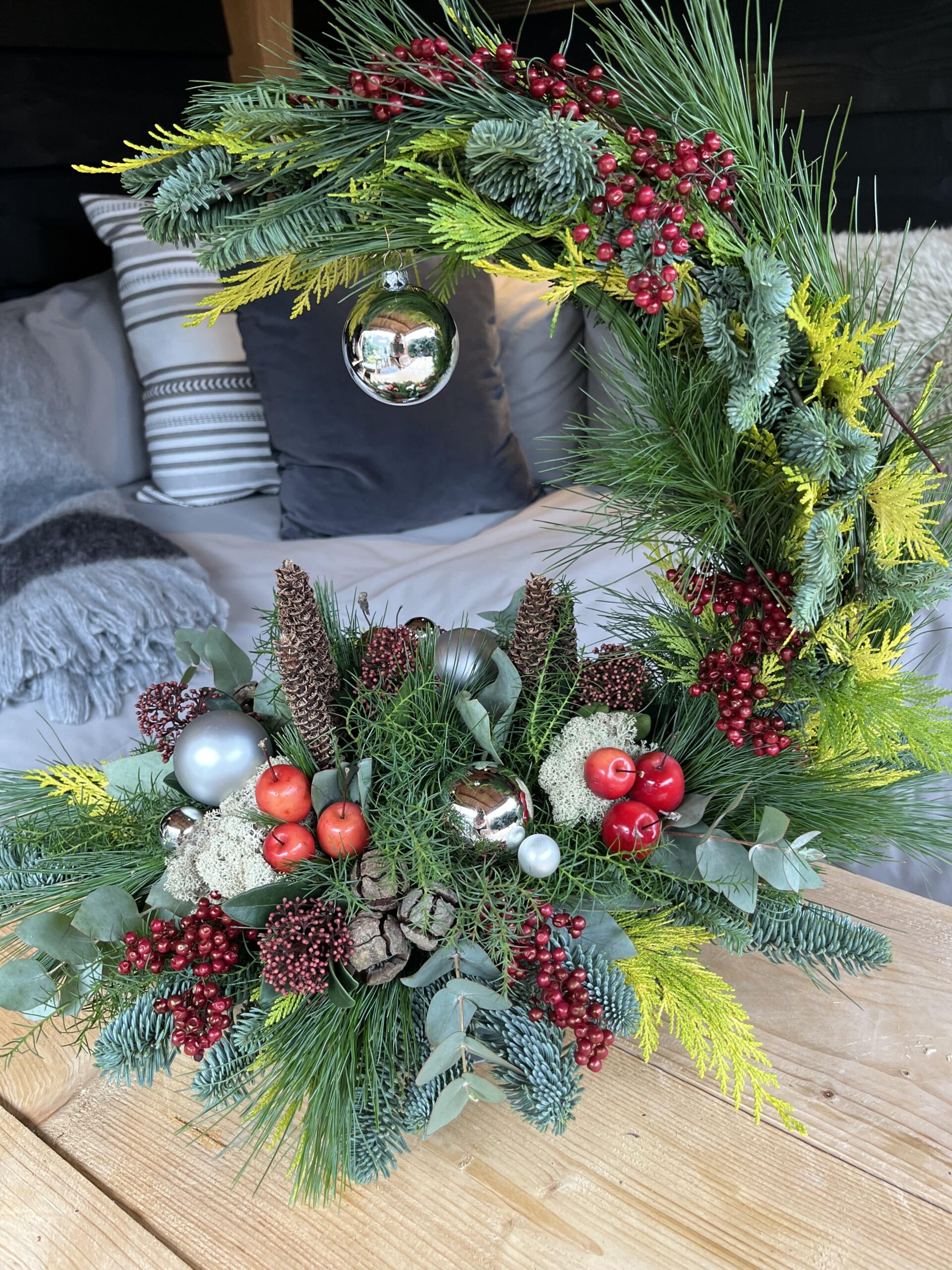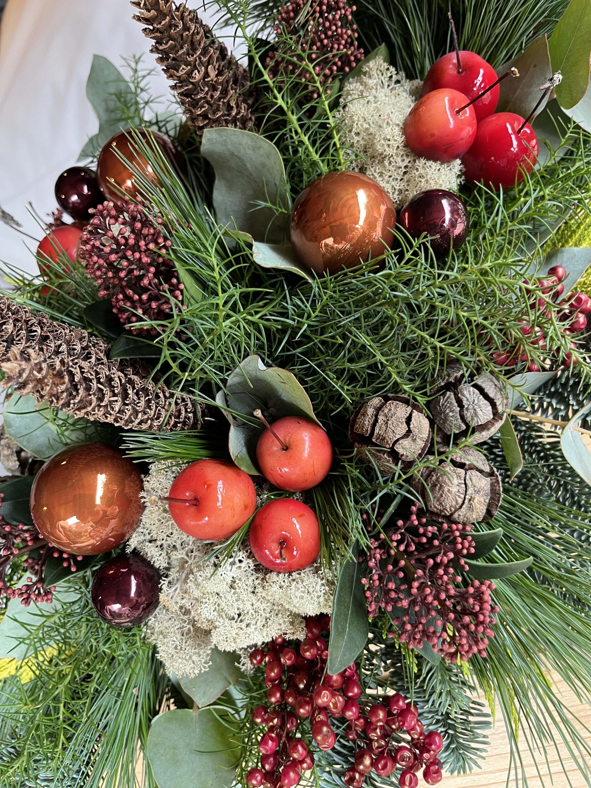 Dit jaar heb ik een warm kerststuk samengesteld op een ijzeren frame in de vorm van een halve maan, opgemaakt in gezellige warme tinten: bruin, brons en rood. Het straalt sfeer en warmte uit aan iedere tafel (Ook kunt u uw kerstverlichting mooi draperen door het kerststuk heen).